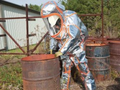 抗閃焰、鋁質披履、防輻射熱1093℃。全身包裹型氣密式化學防護衣,。全封閉型前入式,呼吸器內置型設計,全部邊縫采用內外雙層熱合膠帶焊縫結構