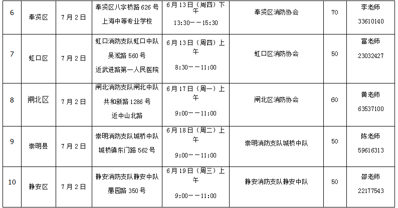 2013年6月建筑物五級消防員培訓(xùn)班將在浦東、楊浦、閘北、閔行等8個區(qū)縣,9個培訓(xùn)點開班,具體信息采集及開班情況見下表(人滿截至):