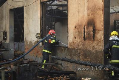 接到報警后,金華江南大隊立即出動2車13人趕赴現場撲救,由于廠房內堆放了大量的木材等易燃品,火勢較為猛烈。經過將近三個小時的撲救后,直到凌晨8點40分左右時,火勢基本被撲滅。為避免出現陰燃復燃的情況,消防官兵隨后用鐵鏟等現場清理器具將堆積的木板層層剝離、拖出,確保再無任何火點出現方才撤離。