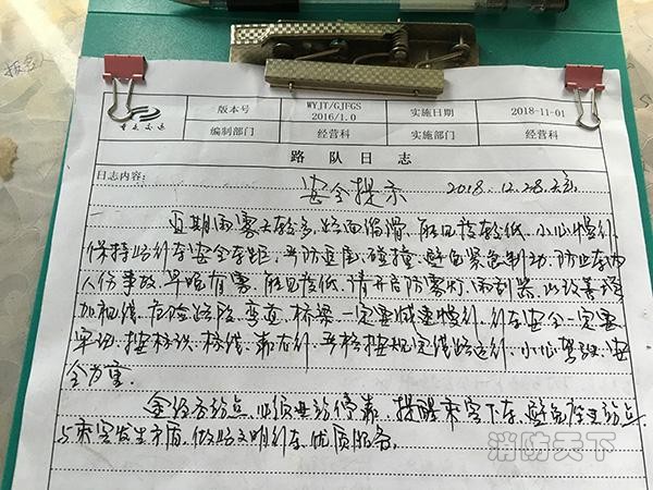 22路調(diào)度室的《路隊(duì)日志》。每名駕駛員上班前都要先閱讀安全提示并簽字。