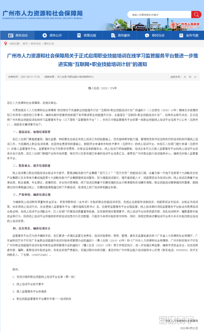 6月21日,廣州市人力資源和社會保障局公布《關于正式啟用職業技能培訓在線學習監管服務平臺暨進一步推進實施“互聯網+職業技能培訓計劃”的通知》,領筑云課堂憑借過硬的技術實力、豐富的海量課程資源、優質的產品服務被廣州市人力資源和社會保障局評為職業技能線上培訓平臺(第一批)。