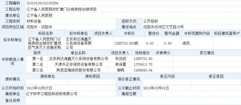 遼寧省人民醫(yī)院(遼寧沈陽(yáng))改擴(kuò)建門(mén)診病房綜合樓氣體滅火設(shè)施采購(gòu)中標(biāo)公示